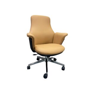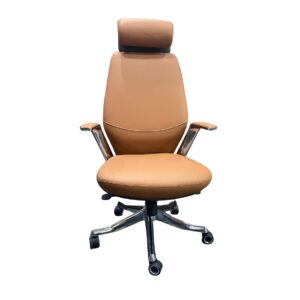 Elevate your workspace with this premium high-back executive chair, crafted for sophistication and all-day support. The smooth tan leatherette upholstery gives a sleek and professional look, while the contoured cushioning and integrated headrest deliver exceptional comfort. Polished chrome armrests with padded tops enhance style and support. Designed for boardrooms, cabins, or high-end office spaces, this chair blends comfort with executive elegance. It features an adjustable height mechanism, 360° swivel, and a reclining back to suit various postures.