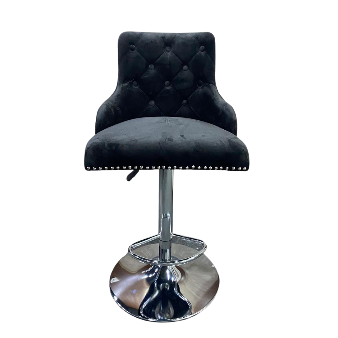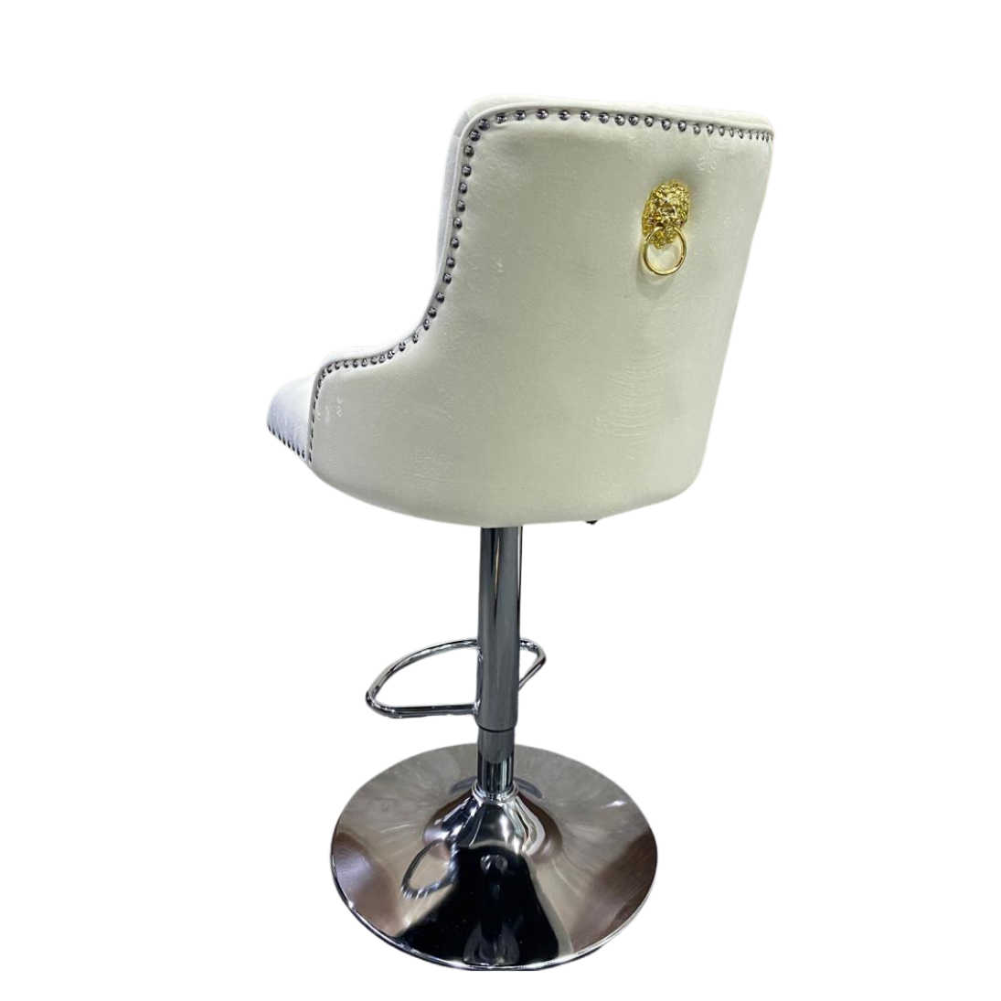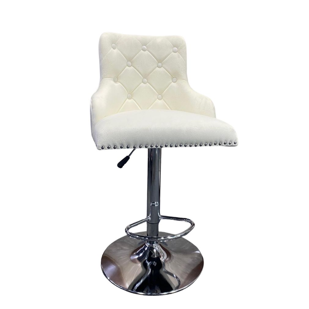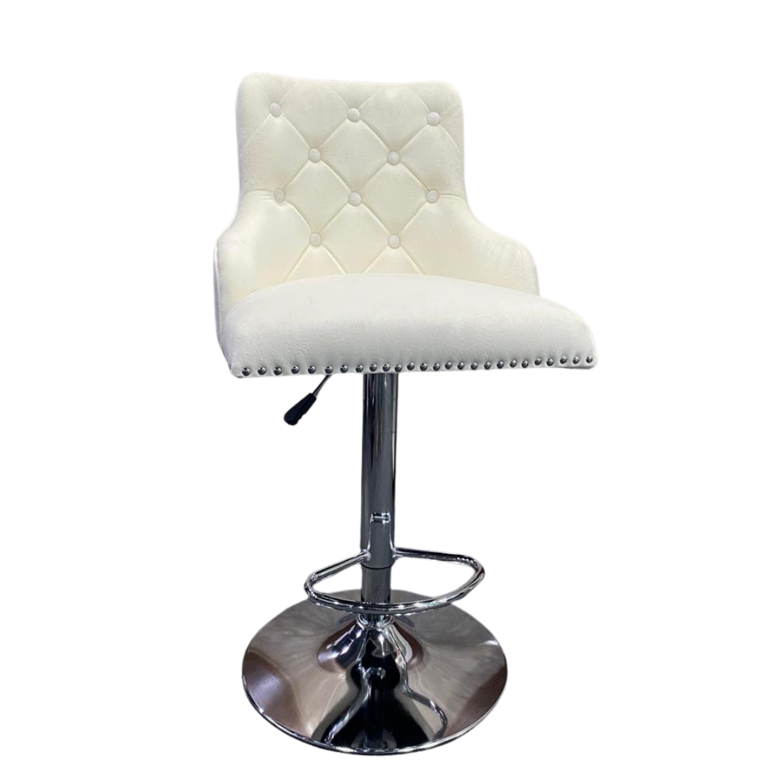Supported by a durable chrome-finished pedestal base, the stool features a 360-degree swivel and a gas-lift mechanism for easy height adjustment, making it perfect for use at kitchen counters, home bars, or high tables. The built-in footrest provides added comfort, and the sturdy round base ensures stability.