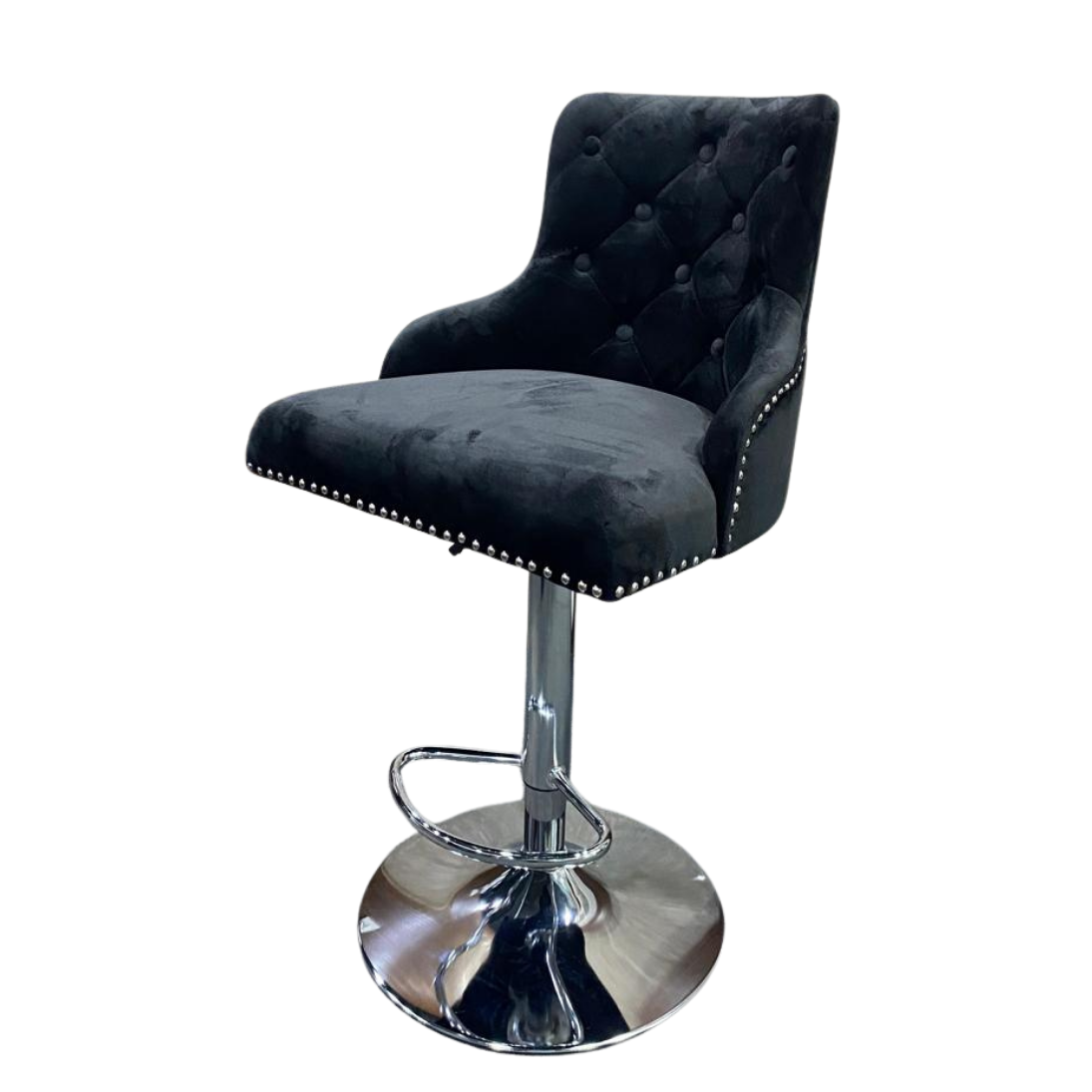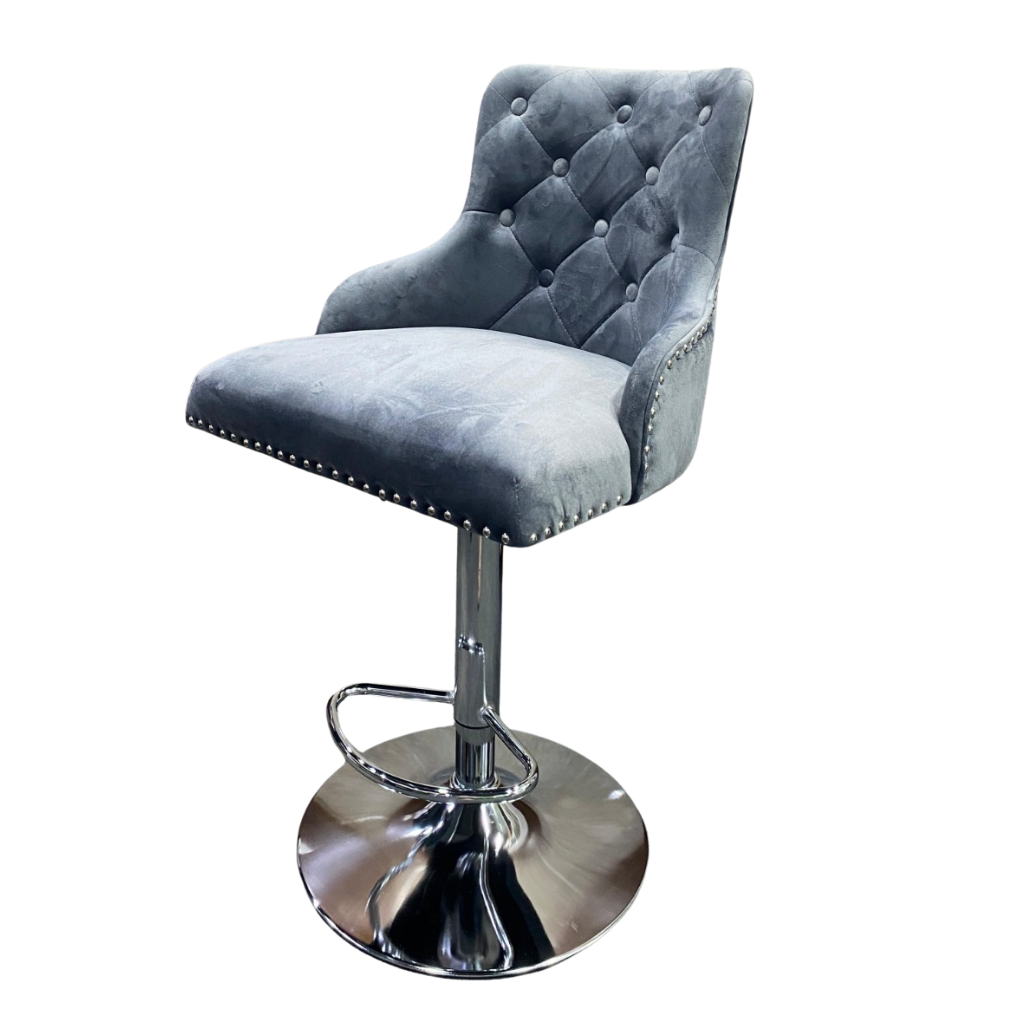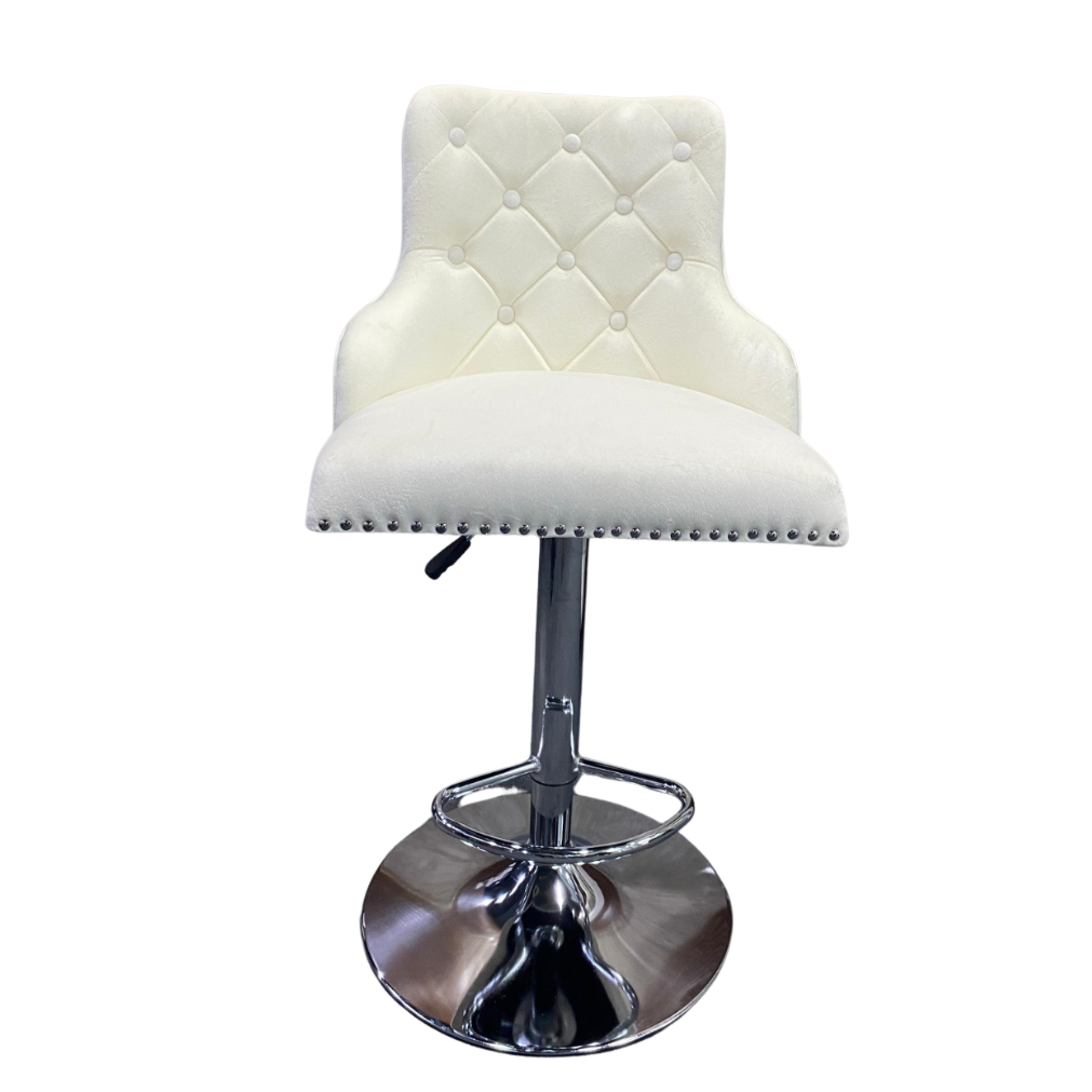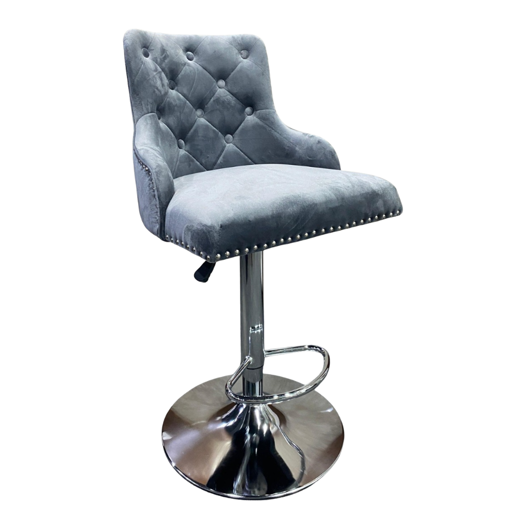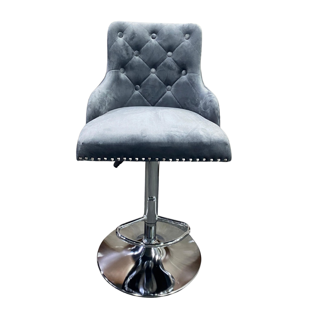 Supported by a durable chrome-finished pedestal base, the stool features a 360-degree swivel and a gas-lift mechanism for easy height adjustment, making it perfect for use at kitchen counters, home bars, or high tables. The built-in footrest provides added comfort, and the sturdy round base ensures stability.