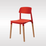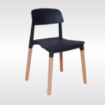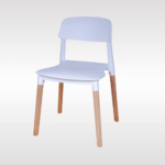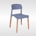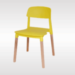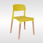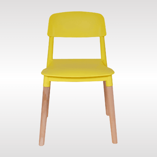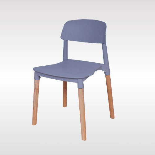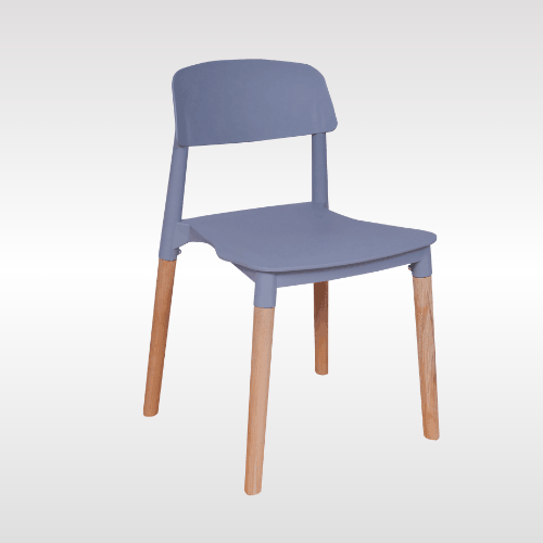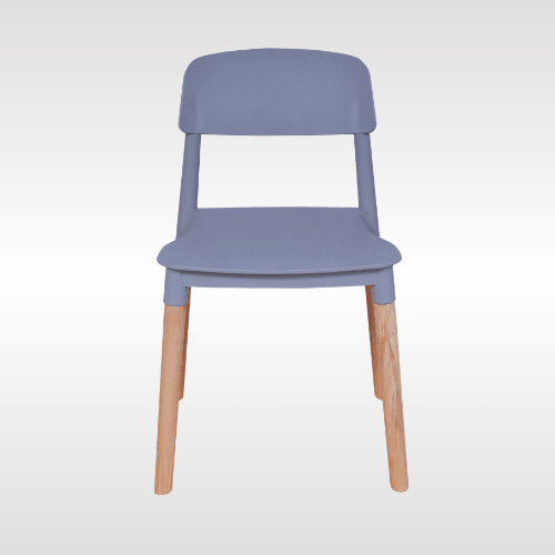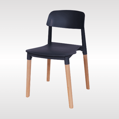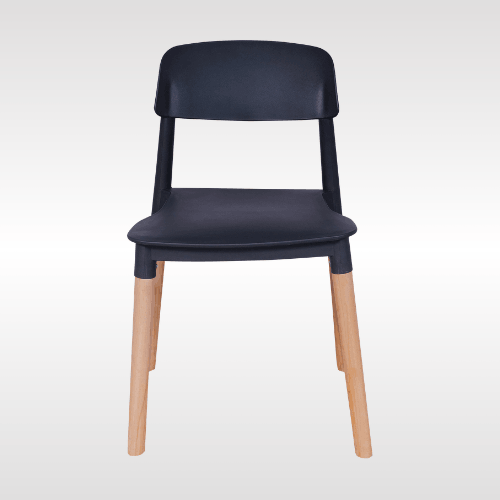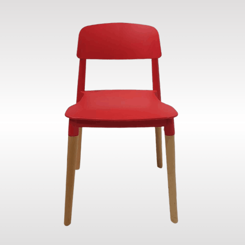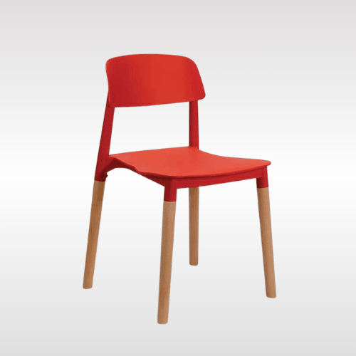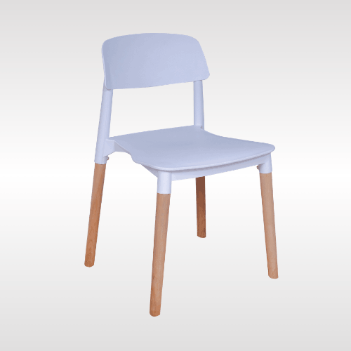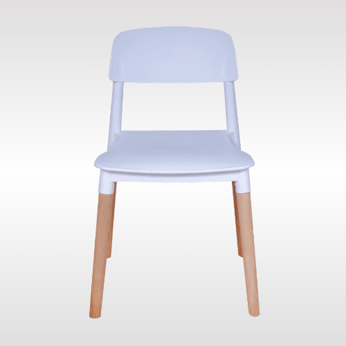 Solid PP plastic chair with natural beech wood legs. Strong, recyclable, and easy to clean. Comfortable contoured backrest and modern one-piece design. Perfect for kitchen, dining, office, bedroom, playroom, or outdoor use.