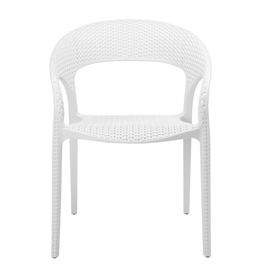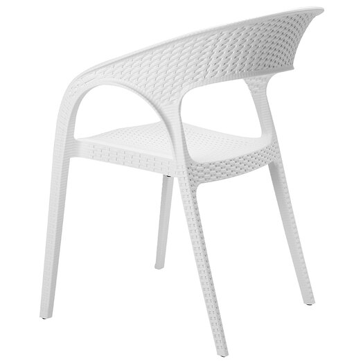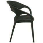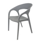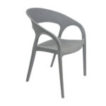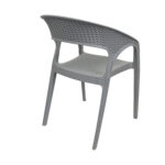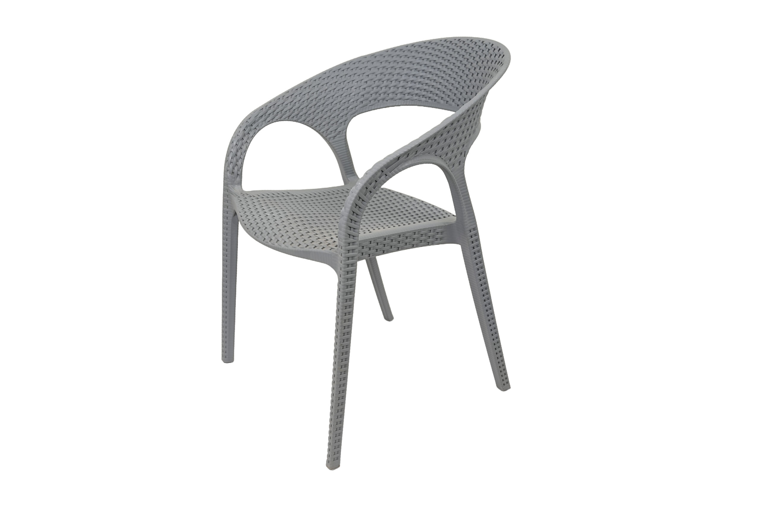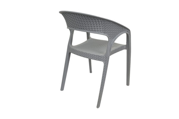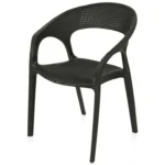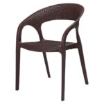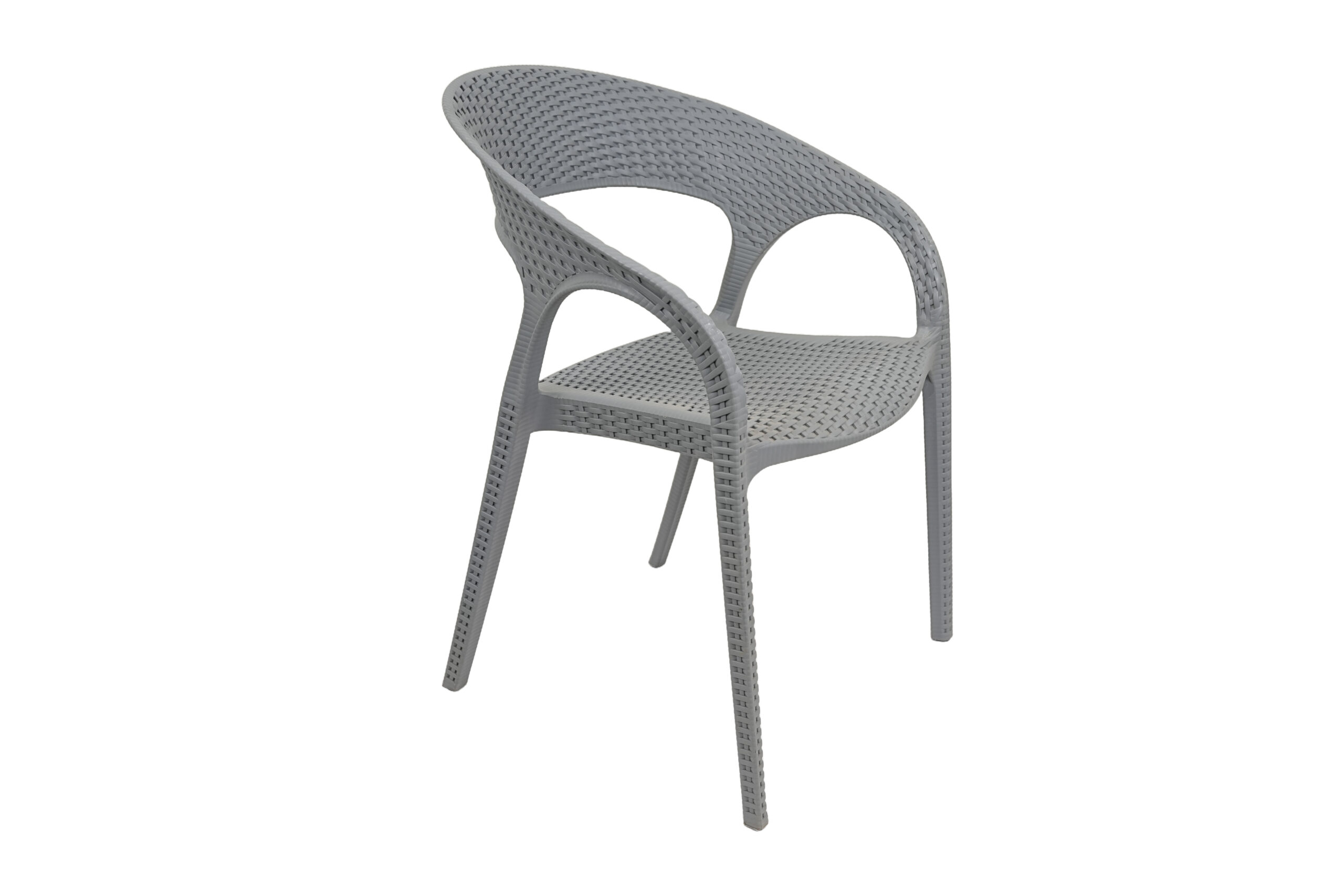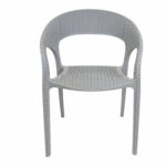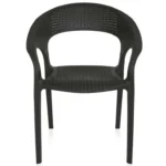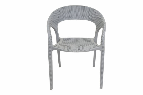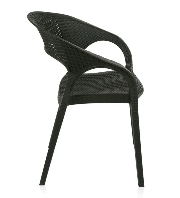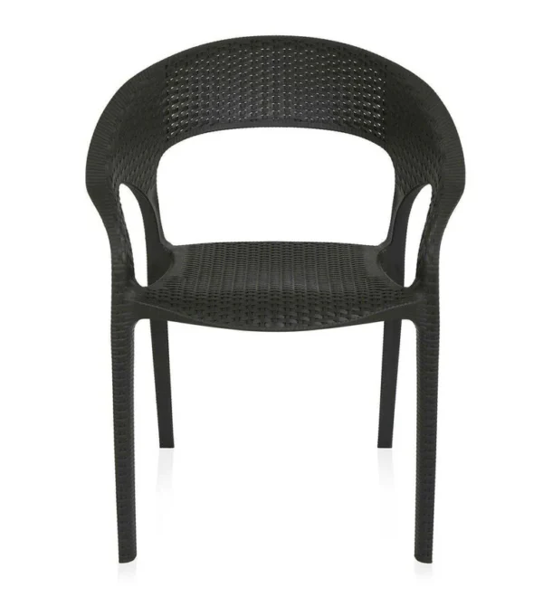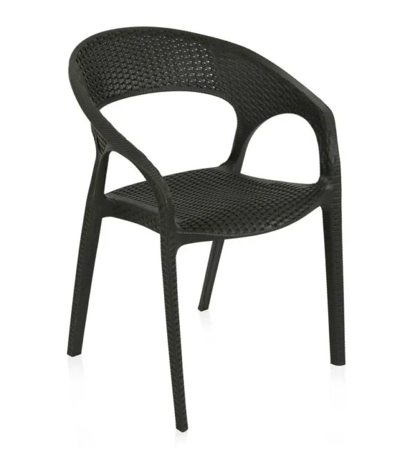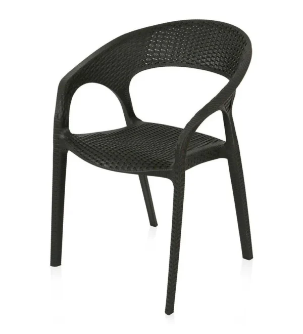 Design: Modern curved-back armchair with woven texture.Material: Durable plastic resin with rattan-style finish.Usage: Suitable for indoor and outdoor use (weather-resistant.Features: Lightweight, stackable, and easy to clean.
