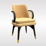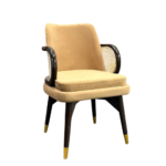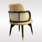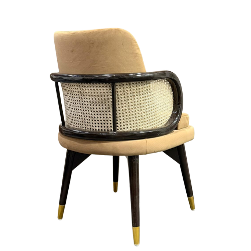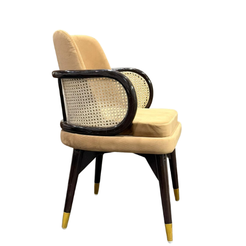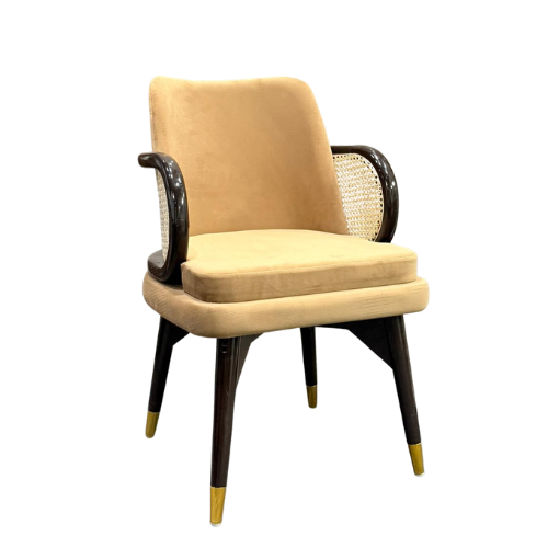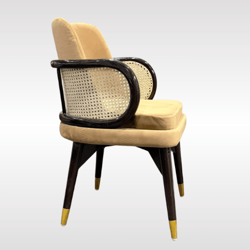 | Luxurious armchair crafted from premium Sheesham wood, known for its strength and beautiful natural grain. The chair features a soft upholstered seat and backrest for superior comfort, complemented by elegant curved wooden armrests with woven cane side panels. Its sturdy wooden frame with stylish metal-tipped legs ensures durability and stability. Perfect for dining rooms, lounges, or living spaces, this chair combines classic craftsmanship with modern elegance. |