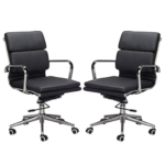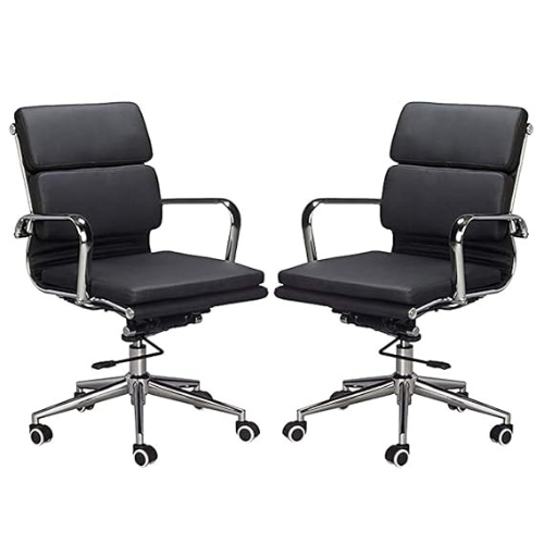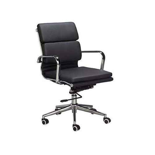 | Sturdy, heavy-duty chrome pyramid base with stabilizing bar swivel. The chrome finish adds elegance and style.COMFORTABLE OFFICE CHAIR: Adjustable height and tilt angle, and thick padded seat can give extra relaxation. Thanks to this office chair’s numerous adjustable features you can be assured of finding a perfect seating position just for you. The vegan leather features matching stitching to bring out the luxurious executive look and feel of the chair. Easy to clean without the need for harsh chemicals. |