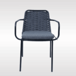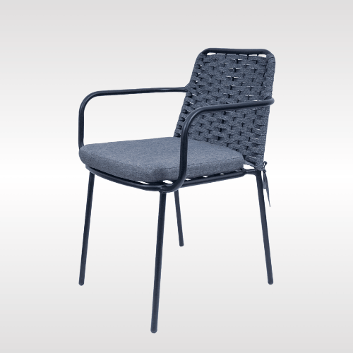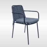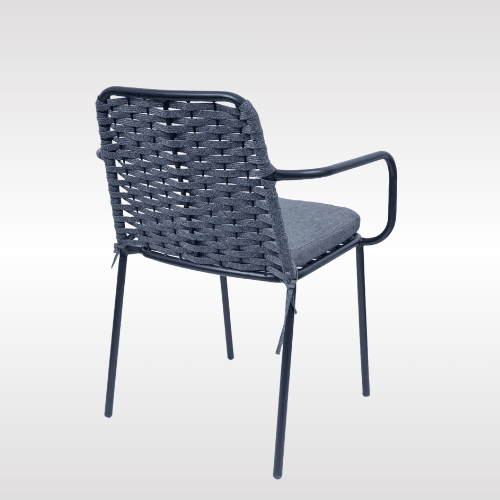| Dining armchair made of aluminum polyester powder coated frame and woven with soft rope. Cuschion in PVC fabric with quick dry foam padding. Stackable.water-repellent fabric, in synthetic fabric, rope.upholstered, stackable, with removable cushion |