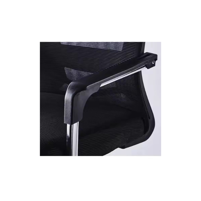 Seat Material: Comfortable fabric seat with cushioned support.Upholstery: Mesh fabric for breathability with cushion padding for comfort.Back Type: High-back design for proper posture and back support.Arm Type: Fixed armrests for added arm and shoulder support.Chair Base: Visitor-type base (stationary, non-swivel).Finishing: Glossy finish enhances appearance and feel.